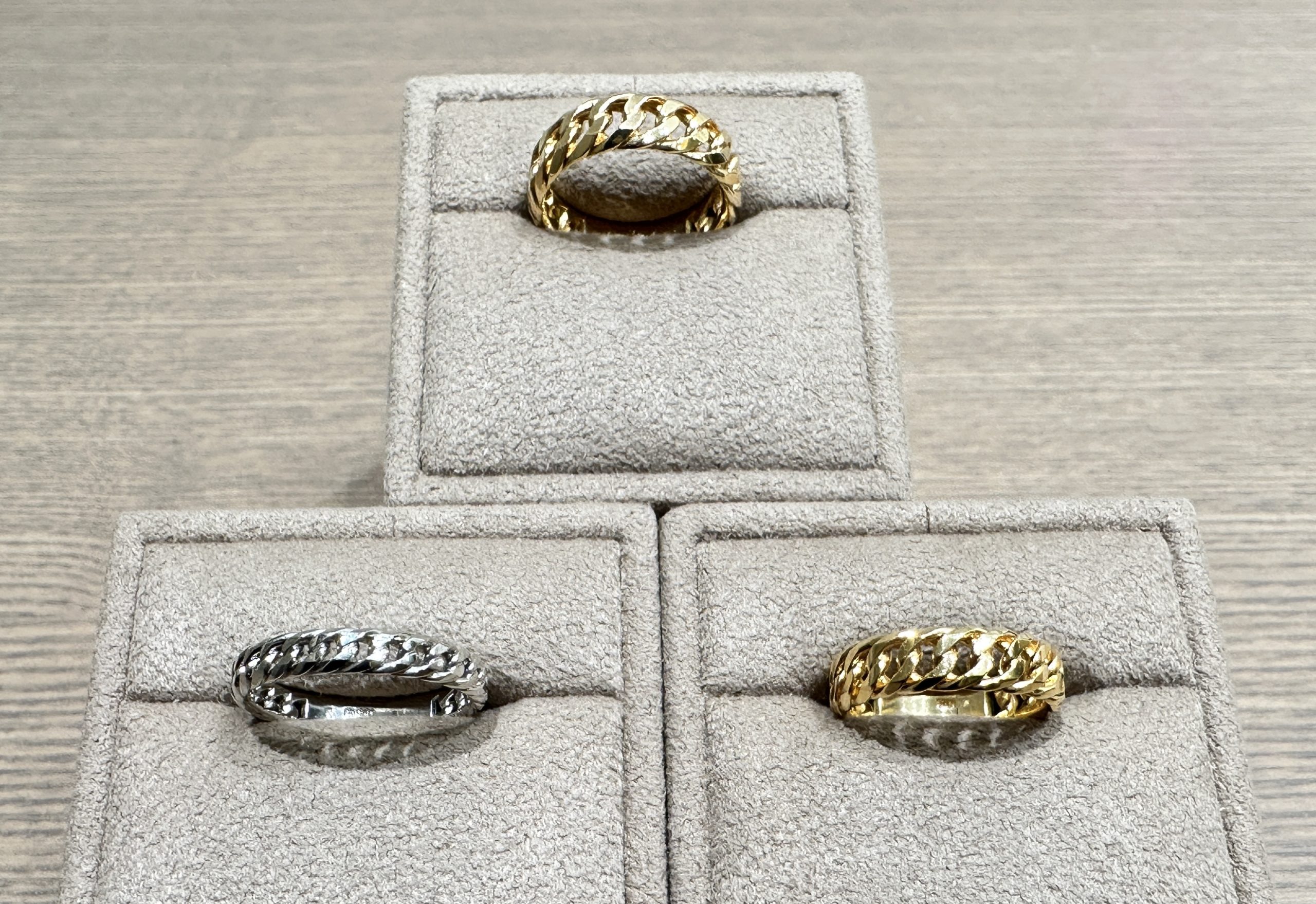 ミニサイズの喜平チェーンがそのままリングになったデザインと、リングの裏側がなめらかに加工されたデザインがあります。