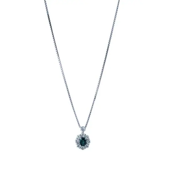 こちらのペンダントでは、メレダイヤの取り巻きデザインが、アレキサンドライトの神秘的な輝きをさらに引き立たせています。