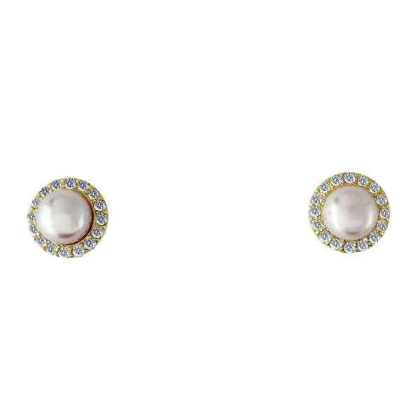 約4ミリの小粒パールの周りを0.1カラットのメレダイヤで取り巻いた、ゴージャスなスタッドピアス。