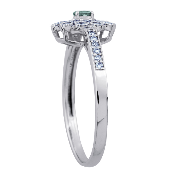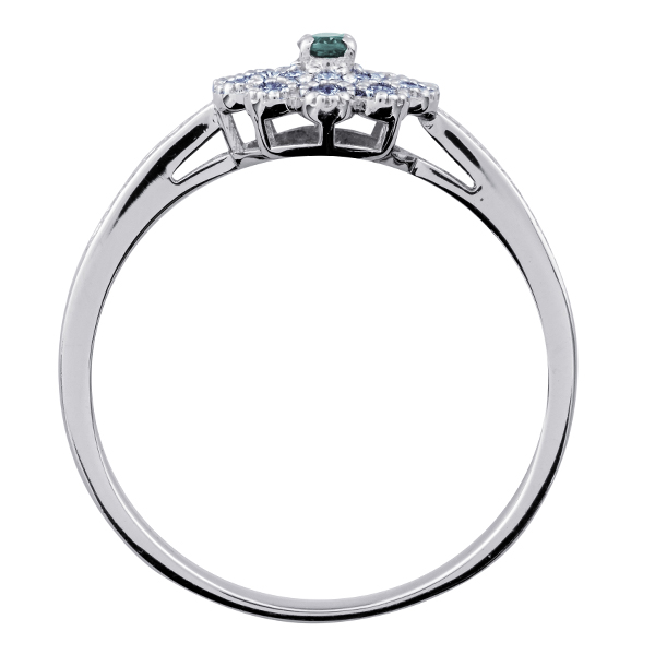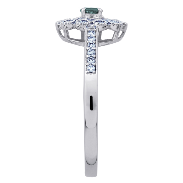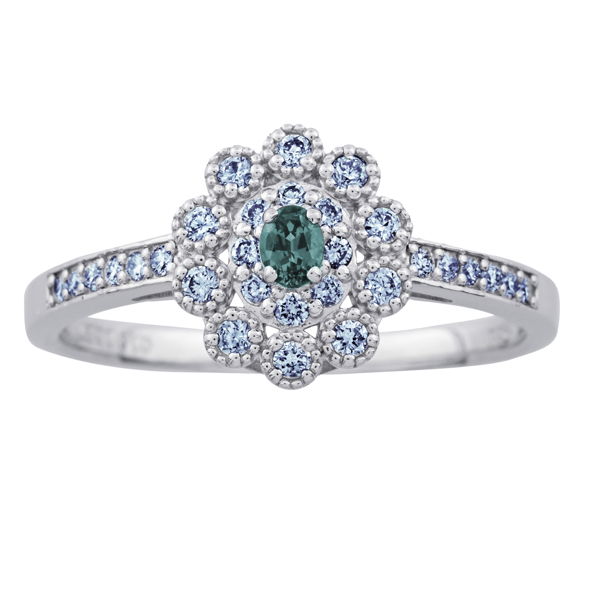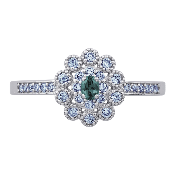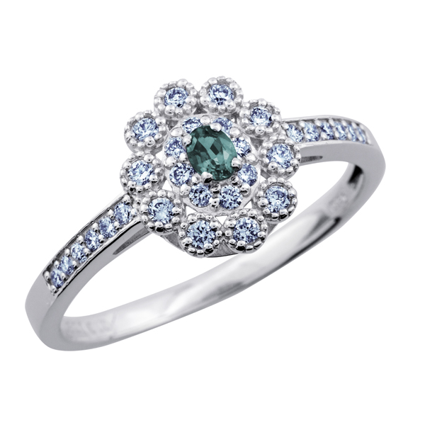 希少石のアレキサンドライトをダイヤモンドで取り巻き、アンティーク調に仕上げたデザイン