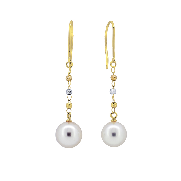 揺れるパールが素敵で、ミラーボールがピンクゴールド・ホワイトゴールド・イエローゴールドと並んだスタイリッシュなピアスです。